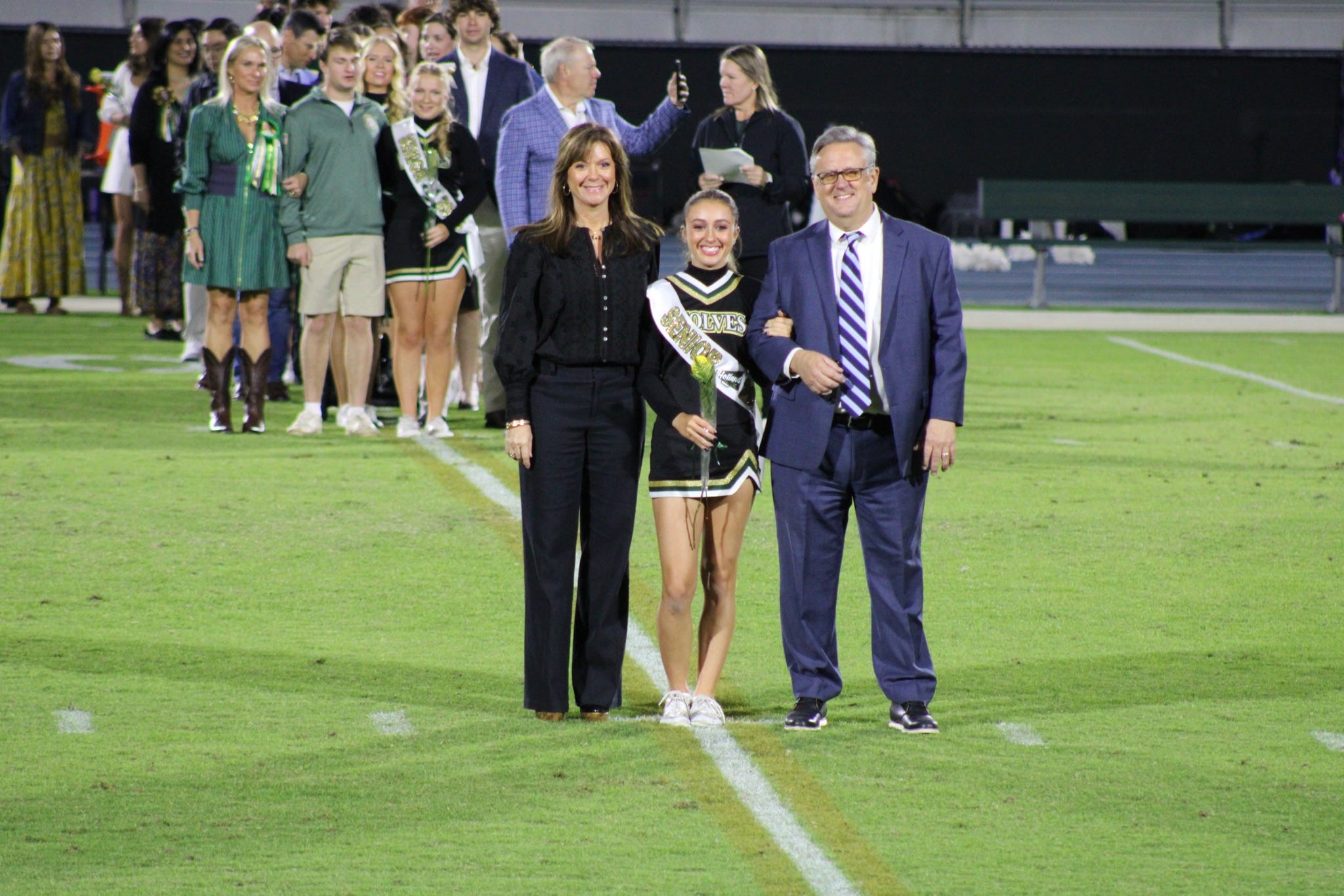 (l to r) H. Ragsdale’s mom, senior Holland Ragsdale, and H. Ragsdale’s dad walked together on senior night to celebrate Ragsdale’s dedication to cheer. Photo Courtesy: Kirsten Scott