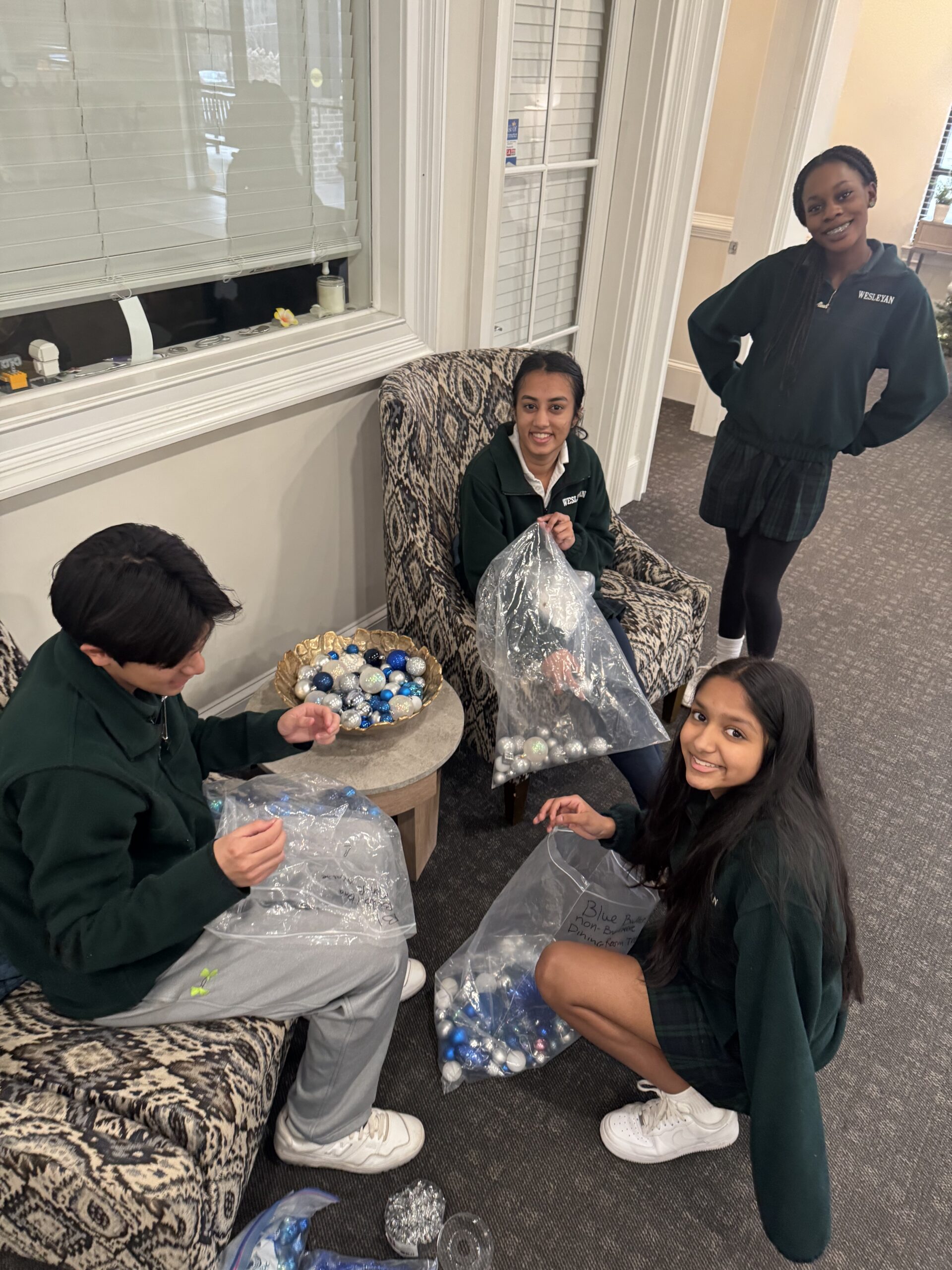 (l to r) Junior Nathan Encinas, Senior Maya Arora, Freshman Saisha Artham, and Freshman Aleah Boateng decorate Addison Assisted Living with ornaments for Christmas. Photo Courtesy: Alyssa Keaton.